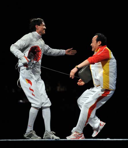 China's Zhong Man celebrates after winning the men's individual sabre final match 15-9 over France's Nicolas Lopez on August 12, 2008 at the Fencing Hall of National Convention Center at the 2008 Beijing Olympic Games. Zhong, 25, gave China their second Olympic fencing title, 24 years after Luan Jujie won the foil in Los Angeles in 1984. [Agencies]