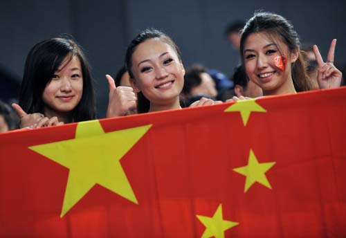 Chinese supporters cheer prior to the men's individual sabre final match China's Zhong Man vs. France's Nicolas Lopez on August 12, 2008 at the Fencing Hall of National Convention Center at the 2008 Beijing Olympic Games. [Agencies]