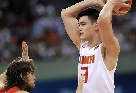 China's Yao Ming (R) and Spain's Marc Gasol fight for a ball during their preliminary round group B basketball match of the 2008 Beijing Olympic Games on August 12, 2008 at the Olympic Basketball Arena in Beijing. [Agencies]