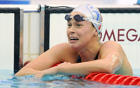 Italy's Federica Pellegrini reacts after winning the women's 200m freestyle swimming final at the National Aquatics Center during the 2008 Beijing Olympic Games in Beijing on August 13, 2008. Pellegrini set a world record time of 1:54.82. [Agencies]