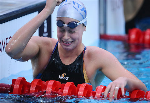 Italy's Federica Pellegrini celebrates after winning the women's 200m freestyle swimming final at the National Aquatics Center during the 2008 Beijing Olympic Games in Beijing on August 13, 2008. Pellegrini won the gold medal with a new world record time of 1.54.82. [Agencies]