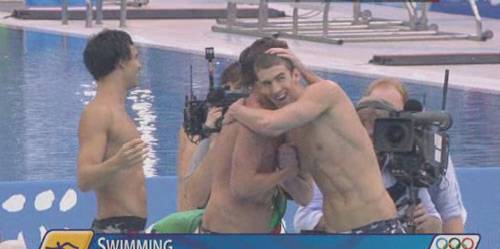 Members of the American swimming team celebrate after winning the gold in the men's 4x200 meters freestyle relay in this TV grab, August 13, 2008. Phelps, Ryan Lochte, Ricky Berens and Peter Vandekaay led the entire race, winning with a time of 6:58.56 and broke the world record. [Sohu.com]