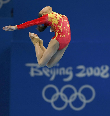 Deng Linlin of China competes on the balance beam in the women's team artistic gymnastics final at the Beijing 2008 Olympic Games August 13, 2008. China won its first Olympic gold medal in women's gymnastics. [Agencies]
