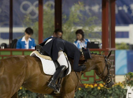 Belgium's Karen Donkers kisses Gazelle de la Brasserie during the equestrian eventing dressage competition at the Beijing 2008 Olympic Games in Hong Kong August 9, 2008. [Agencies]