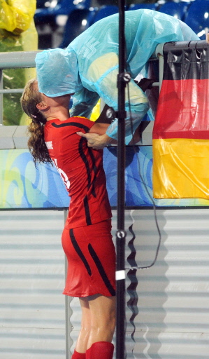 Fanny Rinne (L) of Germany kisses a spectator as she celebrates at the end of their game against Great Britain during their 2008 Olympics Games women's field hockey match in Beijing on August 10, 2008. Germany won 5-1. [Agencies]