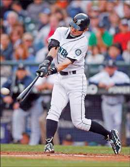 Ichiro Suzuk of Japan, who plays for Seattle Mariners, hits an RBI single against the Tampa Bay Rays during the second inning of their baseball game in Seattle on Aug 9. [Agencies]