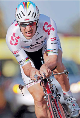 Fabian Cancellara of Switzerland and riding for Team CSC, races to victory in the Prologue of the AMGEN Tour of California on Feb 17, 2008 in Palo Alto, California. [Getty Images]