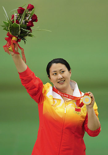 Gold medallist Chen Ying of China celebrates winning the women's 25m pistol shooting competition at the Beijing 2008 Olympic Games August 13, 2008. [Agencies]