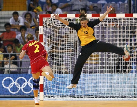 Ramona Maier of Romania (L) scores against Amandine Leynaud of France during their women's preliminary Group A handball game during the Beijing 2008 Olympic Games, at Olympic Sports Center Gymnasium, Beijing, China , August 13, 2008. [Reuters]