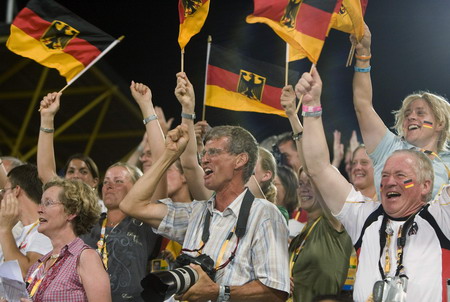 German fans celebrate Hinrich Romeike's victory in the individual final round of the equestrian eventing competition at the Beijing 2008 Olympic Games in Hong Kong August 12, 2008. [Agencies]