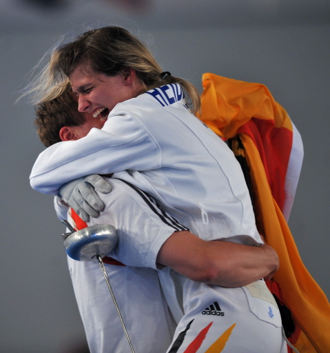 | Germany's Britta Heidemann (R) celebrates with her coach after winning the women's individual epee final match over Romania's Ana Maria Branza (unseen) on August 13, 2008 at the Fencing Hall of National Convention Center as part of the 2008 Beijing Olympic Games. Heidemann won the gold medal. [Agencies] |