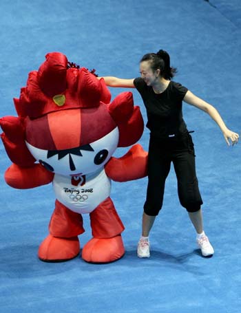 A cheerleader rehearses during a break in the men's doubles quarter final badminton match of the 2008 Beijing Olympic Games, at the Beijing University of Technology Gymnasium in Beijing, on August 13, 2008. [Agencies]
