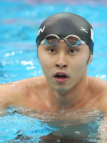 Japan's Kosuke Kitajima is pictured after winning the men's 200m breaststroke swimming final at the National Aquatics Center during the 2008 Beijing Olympic Games in Beijing on August 14, 2008. Japanese breaststroke king Kosuke Kitajima won the 200m gold at the Beijing Games Thursday, completing the Olympic double for the second Games in a row. [Agencies]