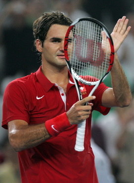 Roger Federer of Switzerland applauses after defeated Tomas Berdych of the Czech Republic during their 2008 Beijing Olympic Games men's singles third round tennis match in Beijing on August 13, 2008. [Agencies]