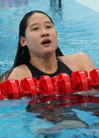Chin's Liu Zige celebrates winning the women's 200m butterfly swimming semifinal at the National Aquatics Center during the 2008 Beijing Olympic Games in Beijing on August 13, 2008. Liu won the gold of the event, August 14, 2008. [Agencies]