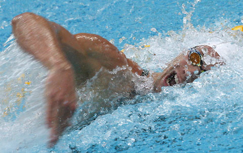 France's Alain Bernard competes during the men's 100m freestyle swimming semifinal at the National Aquatics Center during the 2008 Beijing Olympic Games on August 13, 2008 in Beijing. Bernard won the final. [Agencies]