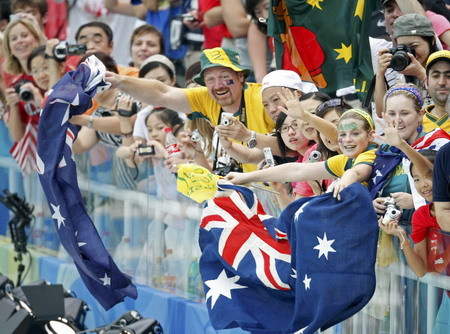 Australian fans cheer on their national team in the swimming events at the National Aquatics Center during the 2008 Beijing Olympics, August 12, 2008. [Agencies]