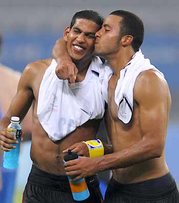 Belgium's players Moussa Dembele (R) kisses Faris Haroun (L) to celebrate their victory over New Zealand after their 2008 Beijing Olympic Games first round Group C men's football match at the Shanghai Stadium on August 13, 2008. Belgium defeated New Zealand 1-0.[Agencies]