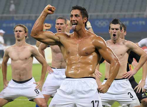 Sam Messam (C-#17) of New Zealand leads his teammates Craig Henderson (L) and Ian Hogg during a traditional Maori "haka" after their 2008 Beijing Olympic Games first round Group C men's football match against Belgium at the Shanghai Stadium on August 13, 2008. Belgium defeated New Zealand 1-0.[Agencies]
