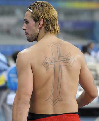 Belgium's goalkeeper Logan Bailly displays the tattoo on his back after their 2008 Beijing Olympic Games first round Group C men's football match against New Zealand at the Shanghai Stadium on August 13, 2008. Belgium defeated New Zealand 1-0.[Agencies]