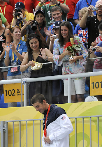 Michael Phelps walks away after giving a bouquet of flowers to a member of the audience (R) after the men's 200m freestyle swimming final at the National Aquatics Center in the 2008 Beijing Olympic Games on August 12, 2008. Phelps broke the world record in the men's 200 metres freestyle with a time of one minute 42.96 seconds at the Beijing Olympics. Phelps went under his previous world record of 1:43.86 set at the world championships in Melbourne in March last year. [Agencies]