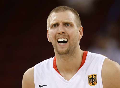 Dirk Nowitzki of Germany reacts during their men's preliminary round group B basketball game against Spain at the Beijing 2008 Olympic Games August 14, 2008.[Agencies]