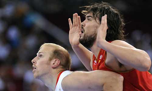 Spain's Mark Gasol (R) is blocked out by Germany's Christopher Kaman (L) during their men's preliminary round group B basketball game at the Olympic Basketball Arena during the 2008 Beijing Olympic Games on August 14, 2008. Spain won 72-59.[Agencies]