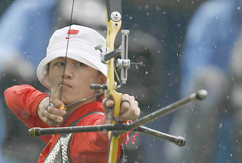Zhang Juanjuan of China takes aim during her women's individual quarter-finalarcheryround against Joo Hyun-Jung of South Korea at the Beijing 2008 Olympic Games August 14, 2008. Zhang became the first archry winner for Chinese delegation since 1984. [Agencies]