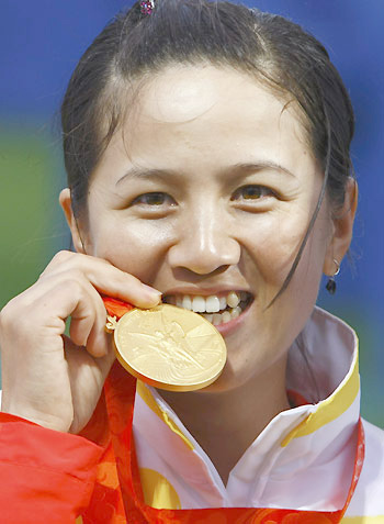 Zhang Juanjuan of China holds her gold medal after winning her women's individual archery final against Park Sung-hyun of South Korea at the Beijing 2008 Olympic Games August 14, 2008. [Agencies]