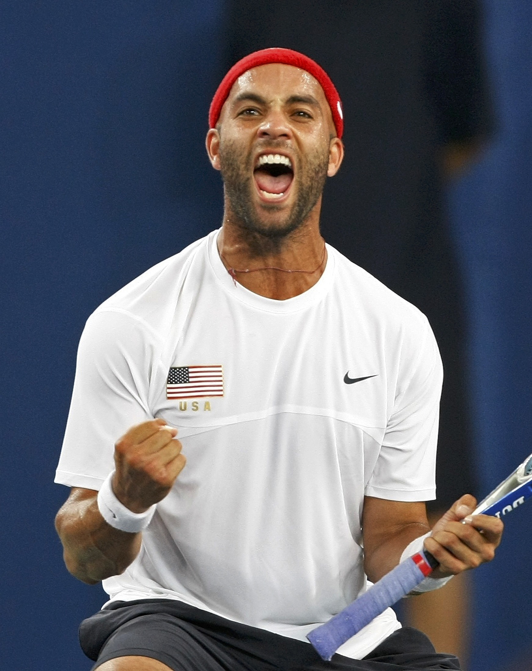 James Blake of the U.S. reacts after defeating Roger Federer of Switzerland during a mens's singles quarterfinal tennis match against at the Beijing 2008 Olympic Games, August 14, 2008. [Agencies] |