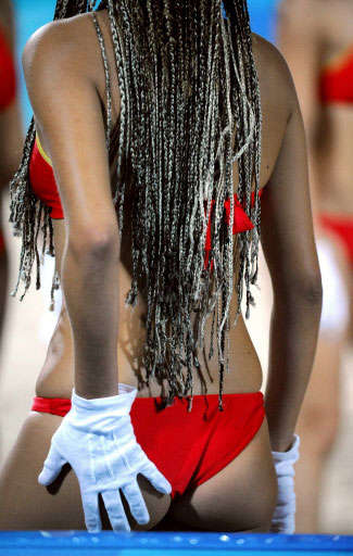 cheerleader waits for performing during the 2008 Beijing Olympic Games men's preliminary beach volleyball match US vs. Japan at Beijing's Chaoyang Park Beach Volleyball Ground on August 14, 2008, in Beijing .[Agencies]