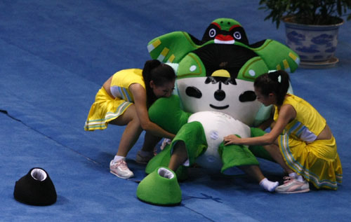 Cheerleaders assist a person dressed as an Olympic mascot who fell at the venue of the badminton matches of the Beijing 2008 Olympic Games August 14, 2008.[Agencies]