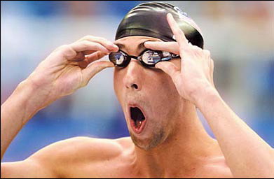 Michael Phelps of the US adjusts his goggles before the start of his men's 200m individual medley semifinal at the National Aquatics Center at the Beijing 2008 Olympic Games August 14 2008. [Agencies]