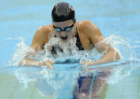 US swimmer Rebecca Soni competes during the women's 200m breaststroke semifinal at the National Aquatics Center during the 2008 Beijing Olympic Games in Beijing on August 15, 2008. Rebecca Soni won the final with a new world record. [Agencies]