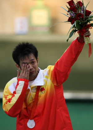 Silver winner Zhu Qinan of China wipes his tears as he celebrates on the podium following the men's 10m air rifle shooting finals for the 2008 Beijing Olympic Games at the Beijing Shooting Hall on August 11, 2008. [Agencies]