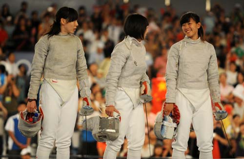 (L-R) China's saber fencers Ni Hong, Bao Yingying and Tan Xue