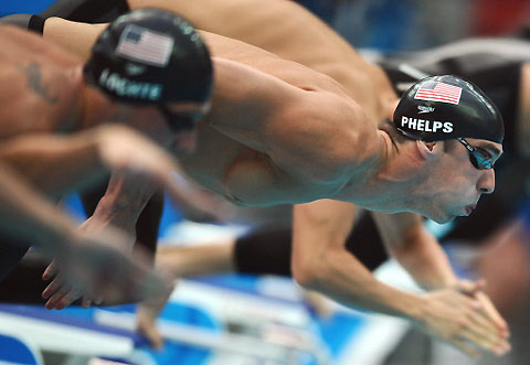 US swimmer Michael Phelps starts the men's 200m individual medley final at the National Aquatics Center during the 2008 Beijing Olympic Games in Beijing on August 15, 2008. Phelps set a new world record in the men's 200 metres individual medley with a time of one minute 54.23 seconds in the final. [Agencies]