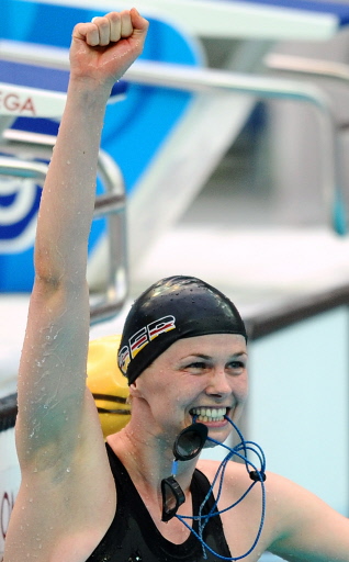 Germany's Britta Steffen celebrates winning the women's 100m freestyle final at the National Aquatics Center during the 2008 Beijing Olympic Games in Beijing on August 15, 2008. Germany's former world record holder Britta Steffen finished powerfully to overhaul world record holder Libby Trickett and win the women's 100 metres freestyle gold medal. [Agencies]