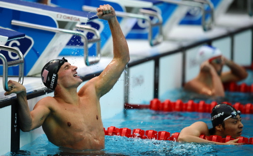 US swimmer Ryan Lochte celebrates winning the men's 200m backstroke final at the National Aquatics Center during the 2008 Beijing Olympic Games in Beijing on August 15, 2008. Lochte broke the men's 200m backstroke world record in winning Olympic gold in 1min 53.94sec. [Agencies] Video