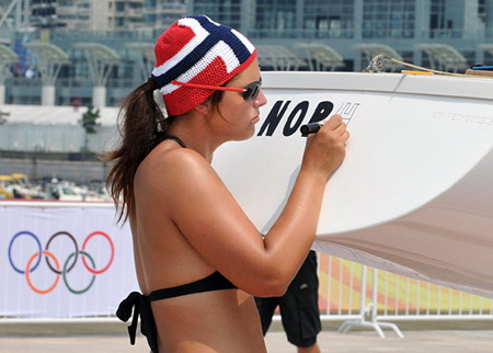 A Norwegian sailor gets her yacht ready for Olympic racing, August 4th,2008. During the sailing competition at the Olympic Sailing Center in Qingdao, the female sailors have become a unique sight with their healthy figures and sexy Bikinis.[Xinhua]