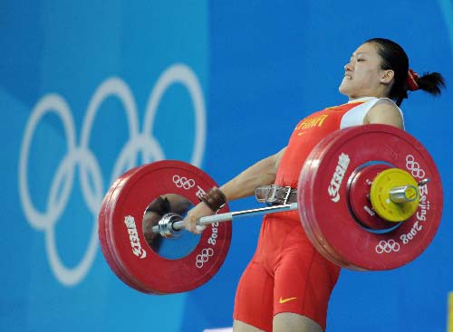 Cao Lei of China competes in the women's75 kg weightlifting event during the 2008 Beijing Olympic Games on August 15, 2008. Cao won the gold medal in the event. [Sohu.com]