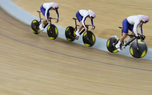 (R-L) Great Britain's Jamie Staff, Jason Kenny and Chris Hoy compete in the 2008 Beijing Olympic Games men's track cycling team sprint qualifying at the Laoshan Velodrome in Beijing on August 15, 2008. Scotland's Chris Hoy anchored Britain's three-man sprint team to the fastest time in qualifying for the first round of the competition here Friday.[Agencies]