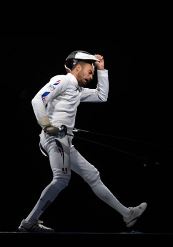 France's Fabrice Jeannet reacts as he competes against Poland's Radoslaw Zawrotniak (not pictured) during the men's team epee gold medal match France vs. Poland on August 15, 2008 at the Fencing Hall of National Convention center, as part of the 2008 Beijing Olympic Games.[Agencies]
