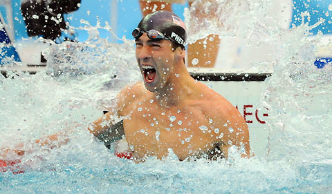 US swimmer Michael Phelps reacts after winning the men's 100m butterfly swimming final at the National Aquatics Center during the 2008 Beijing Olympic Games in Beijing on August 16, 2008. The victory gave him a seventh gold medal here and equalled Mark Spitz's 1972 record. [Agencies]