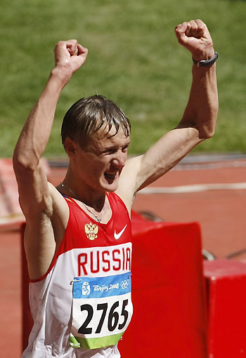 Valeriy Borchin of Russia celebrates after winning the men's 20km walk of the athletics competition at the National Stadium during the Beijing 2008 Olympic Games, August 16, 2008. [Agencies]