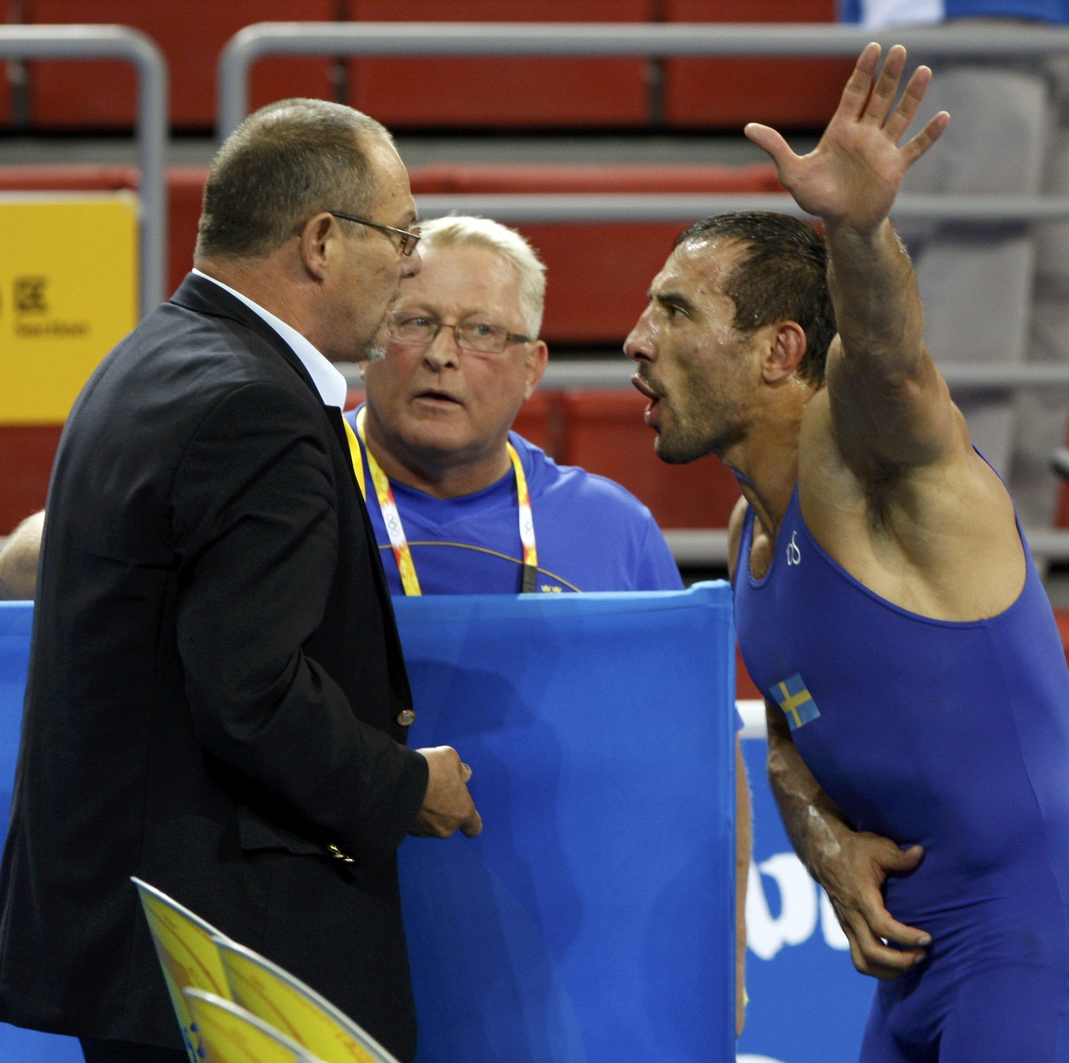 Ara Abrahamian of Sweden (R) argues with referee Jean-Marc Petoud of Switzerland (L) as his coach Leo Myllar watches after Abrahamian's 84kg men's Greco-Roman wrestling semi-final match against Andrea Minguzzi of Italy at the Beijing 2008 Olympic Games August 14, 2008.[Agencies] |