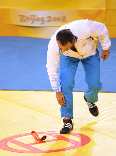 Greco-Roman wrestler Ara Abrahamian of Sweden places his bronze medal at the center of the competition mat in protest of the result in the men's Greco-Roman 84kg wrestling category during the 2008 Beijing Olympic Games on August 14, 2008. [Agencies] |