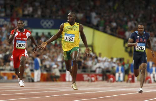 Usain Bolt of Jamaica (C) celebrates winning the men's 100m final of the athletics competition in the National Stadium at the Beijing 2008 Olympic Games August 16, 2008. [Agencies]