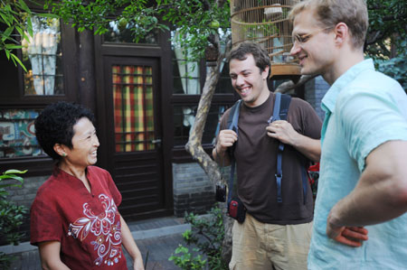 Wang Zhixi, hostess of an Olympic homestay for foreign visitors, talks to two American guests about the traditional Chinese architecture in Beijing August 15, 2008. Wang's home, at Dajinsi Hutong near Shichahai Lake, a tourist attraction in downtown Beijing, is one of about 600 homestay families chosen for foreign visitors during the Beijing Olympic Games. [Xinhua]