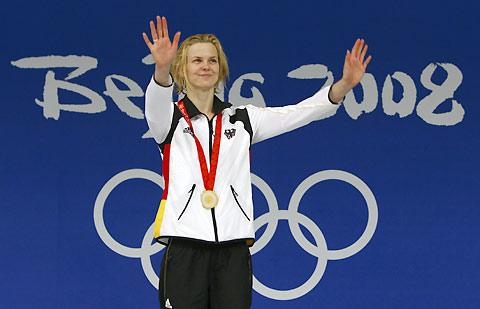 Britta Steffen of Germany gestures after receiving the gold medal for the women's 50m freestyle swimming final at the National Aquatics Center during the Beijing 2008 Olympic Games August 17, 2008. [Agencies]